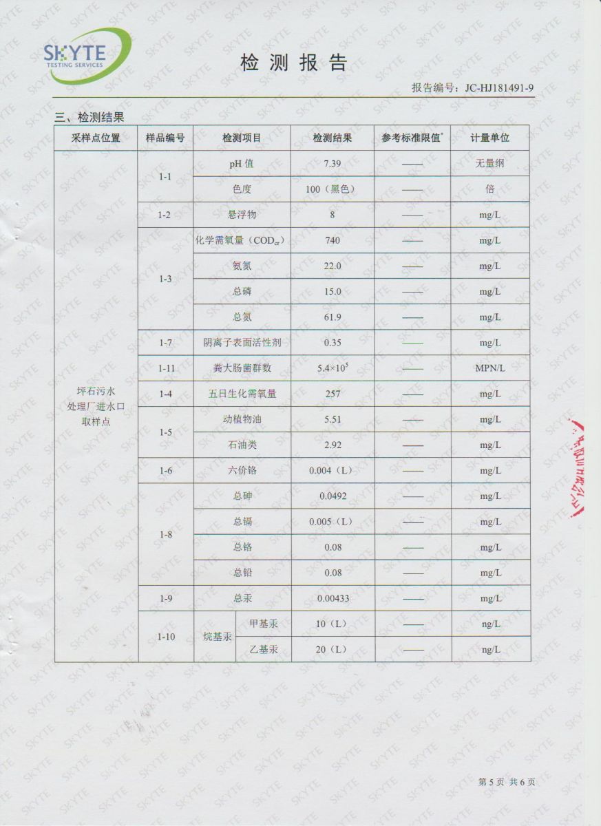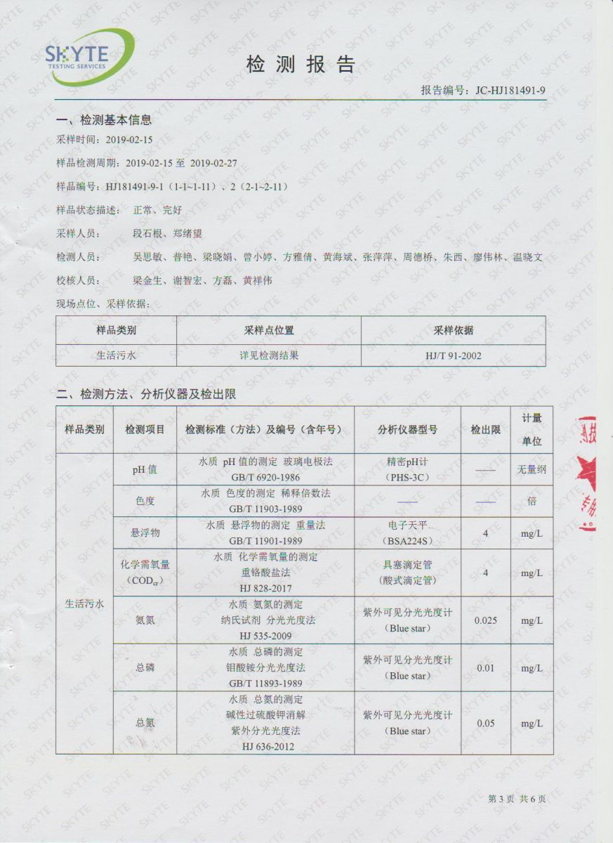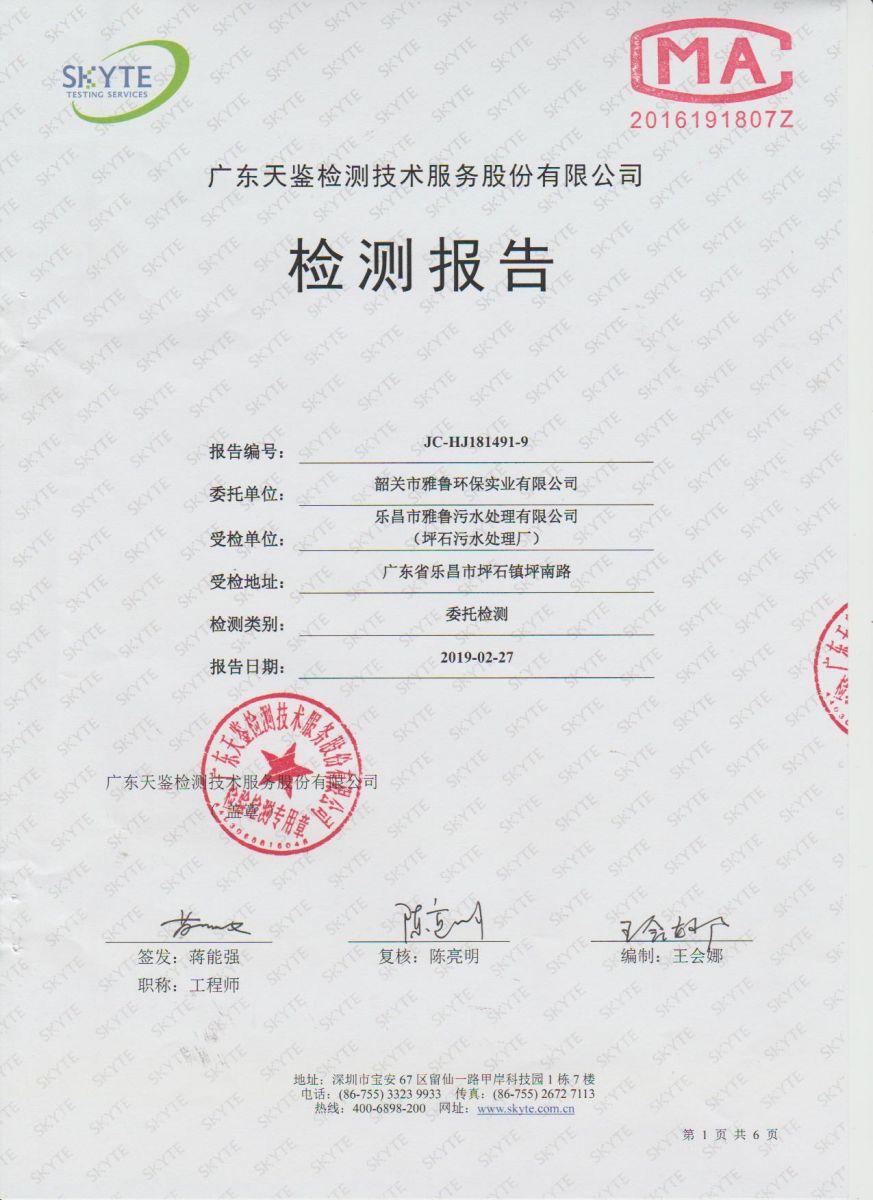 坪石污水處理廠2019年2月份第三方監測報告